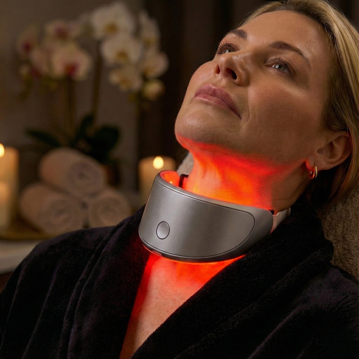 Kırmızı (630nm) - Anti-Aging & Kolajen: Yüz maskesinde olduğu gibi; cilt altına inerek kolajen üretimini tetikler. Boyundaki derinleşmiş Venüs Halkalarını ve ince çizgileri doldurarak pürüzsüzleştirir.